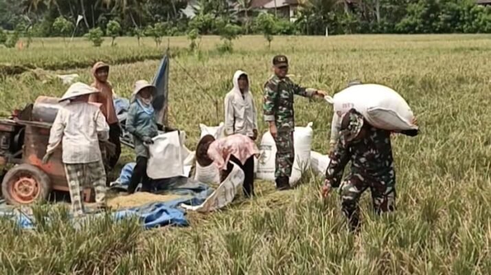 Satgas TMMD ke-126 terlihat menyatu dengan warga, bahu-membahu membantu proses dores padi (perontokan padi) di hamparan sawah Desa Lebakharjo