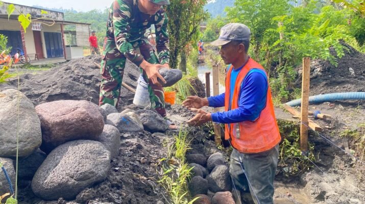 Satgas TMMD 126 Lebakharjo Kodim 0818 Malang Batu dari Angkatan Udara melakukan pemasangan batu dan kawat bronjong di pinggiran Sungai Lebakharjo sebagai bagian
