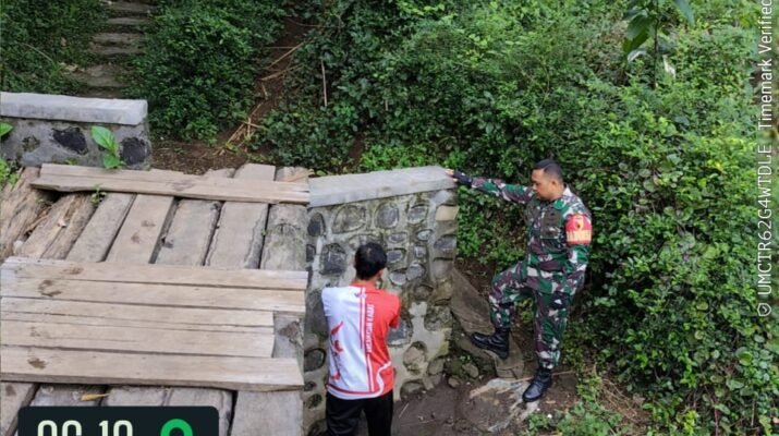 Kedayunan – Sabtu pagi, 29 November 2025, Babinsa Kedayunan Serda Okto Hetharia turun langsung ke lapangan melakukan pengecekan lokasi jembatan penghubung antara Desa Kedayunan