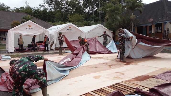 Koordinasikan Penataan Pengungsian, Danramil 07 Randuagung Pimpin Perapian Tenda di SMPN 02 Pronojiwo.