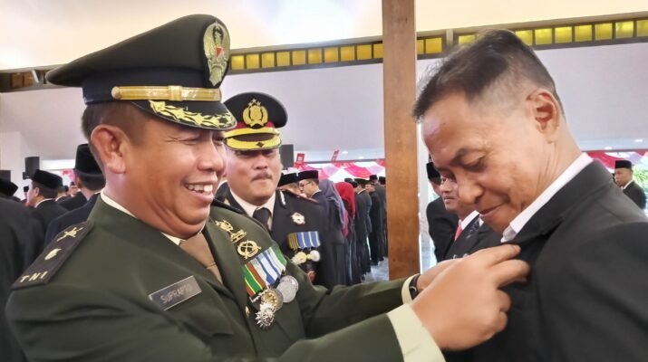 Banyuwangi – Kasdim 0825/Banyuwangi, Mayor Kav Suprapto, menghadiri upacara penganugerahan Tanda Kehormatan Satya Lencana Karya Tahun Anggaran 2025 yang diberikan kepada Aparatur Sipil Negara (ASN) di lingkungan Pemerintah Kabupaten Banyuwangi. Kegiatan tersebut berlangsung khidmat di Pendopo Sabha Swagata Blambangan, Kamis (14/08/2025).