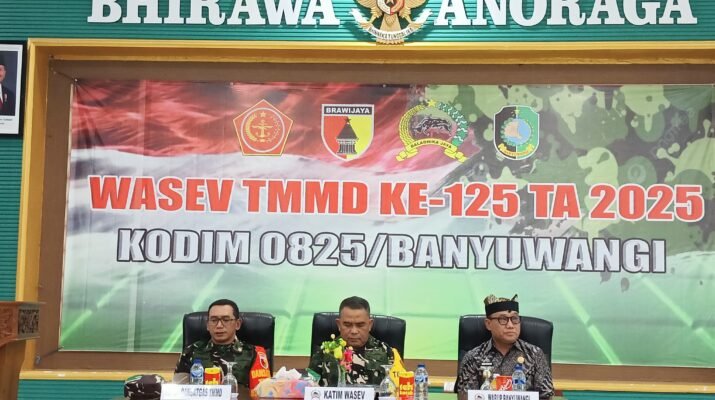 Banyuwangi – Kamis (07/08/2025), Kodim 0825/Banyuwangi menerima kunjungan Tim Pengawas dan Evaluasi (Wasev) TMMD ke-125 TA 2025 bertempat di Aula Makodim 0825 Jl. R.A. Kartini, Banyuwangi. Kegiatan ini dipimpin oleh Katim Wasev Brigjen TNI (Mar) Werijon, M.Han., yang juga menjabat sebagai Waaspotmar Kasal. Kegiatan berlangsung dari pukul 08.17 WIB hingga 09.13 WIB dan dihadiri oleh unsur Forkopimda,Kepala SKPD terkait, jajaran TNI/Polri, serta sejumlah pejabat Pemkab Banyuwangi.
