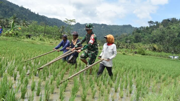 Dansatgas TMMD Ke-126 Kodim 0818/Malang-Batu, Letkol Czi Bayu Nugroho, bersama petani melakukan kegiatan matun pembersihan gulma padi secara tradisional di lahan sawah Desa Lebakharjo Kecamatan Ampelgading Kabupaten Malang